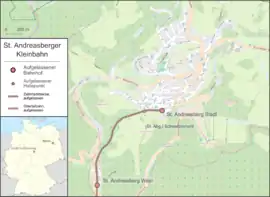 The St. Andreasberg rack railway (German: St. Andreasberger Kleinbahn) operated a now-closed, standard gauge, rack railway in the Upper Harz in central Germany. To begin with its shareholders were the state of Prussia, the Province of Hanover und the town of Sankt Andreasberg. After 1924, it was operated by the Hanover State Light Railway Office.