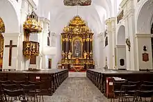 The baroque church was built in 1721, commissioned by Cardinal Imre Csáky, by the Milanese architect Giovanni Battista Carlone and dedicated to St. Anne in 1746. In 1811 the church tower was damaged by fire in 1834 and were built the two towers projected by Ferenc Povolny. In 1928 new entrances were added and restoration works were being renovated entrance with the creation of a wide staircase, and the three statues on the facade dedicated to St. Emeric of Hungary, St. Stephen and the Virgin and Child Jesus.[3]