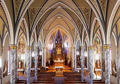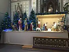 The church building has a shrine-like atmosphere with 32 statues, 4 murals, 2 paintings, beautiful stained-glass windows, and stations of the cross. An additional 10 statues are located in a small park/shrine to Mary to the south of the church. In 2015 the parish counted 460 families.[6]