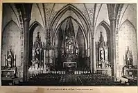 A census taken in 1904 counted 42 German families, mostly farmers, 56 Irish families, mostly railroad workers, and 8 French families. In 1904 a new, white-oak main altar with ornate reredos was constructed, along with an additional two side altars of white walnut dedicated to St. Joseph and St. Anthony (right). The side altars of the Sacred Heart and the Blessed Mother were original to the church and also made of white walnut. By 1907 the parish census counted 738 people. The Catholic influence in the Chillicothe area was evidenced by the Franciscan's Historical Sketches of the parish (1905), which contained over 100 advertisements of one-quarter page or more.[2]