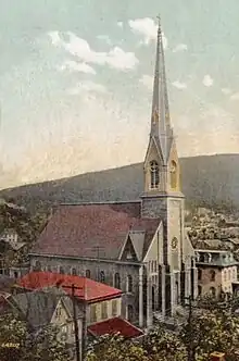 The church tower was completed in 1875 and four years later the interior was finished.[3] The church tower, with four large bells weighing 8,500 pounds, was 207 feet (63 m) high. An artist from Philadelphia created the interior frescoes. A depiction of the Resurrection of Christ, surrounded by the four Evangelists, was created in a 22 feet (6.7 m) fresco on the ceiling. Works of art included life-size paintings of St. Edward, the patron of the church, St. Patrick, and The Crucifixion and were hung over the main altar. The twelve Apostles were painted on the walls. Father Kock imported two statues from France that sat on either side of the altar. They represented Christ meeting His Mother on His Way to Calvary and the Descent from the Cross.[2] The church, which initially served up to 1,400 people,[4] is located at Shamokin Street and Webster Street near downtown Shamokin.[5] The third St. Edward's Catholic Church, within the Diocese of Harrisburg, was dedicated on June 6, 1880.[2][6]