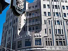 The hotel was designed by architect William Prouse in the Art Deco style and built in 1929-30 of steel-framed reinforced concrete at a cost of almost £100,000.[2] The hotel was originally to be called the Majestic Hotel, as Prouse had also designed the nearby Majestic Theatre and the two buildings had features in common, but the name was changed during the construction period.[1] During excavation for the foundations it was discovered that the site contained substantial deposits of blue clay, so the builders had to put in deep concrete piles to ensure stability.[2] Hotel St George opened on 1 December 1930. The hotel's main entrance was on Boulcott Street but the bars could be accessed directly from an entrance on Willis Street.[3] Originally the hotel had over 100 guest bedrooms, including some suites, and 30 staff bedrooms, with each guest bedroom having its own bathroom and telephone.[4][3] The bedrooms were in two identical eight-storey wings facing Boulcott and Willis Streets, while the central area housed lounges and public areas.[1] The dining room could seat over 200 people, and the Palm Lounge was available for afternoon teas and functions.[3]