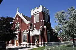 St. John the Baptist Catholic Church is a Late Gothic Revival building, constructed of red brick on a stone and reinforced-concrete foundation.[2] The church has a gable roof, a square tower projecting from the facade, and a rectangular wing to the east. The water table, window sills, and hood moldings are constructed from concrete, while other decorative elements are made from galvanized iron. The front gabled facade of the church is divided into three sections by buttresses. The center section contains a Tudor-arch double door entrance, above which is a low, three-sided, pointed-arch window. The bays to each side contain single Tudor-arch windows.[4] A five-sided apse at the rear of the building once housed the sanctuary. The stained glass windows in the church were reportedly made in Munich, Germany.[2]