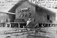 The St. Johns and Lake Eustis Railway was chartered in 1879 and construction started at Astor on the St. Johns River. The line was built 3 ft (914 mm) narrow gauge and its rails passed through Altoona, Umatilla, and Fort Mason before reaching Eustis, 27 miles, in 1880. Construction continued southward through Tavares, reaching Lane Park on Big Lake Harris, 7.5 miles, in 1882–83.[1] The line was then extended 15 miles from Fort Mason, around the north and west sides of Lake Eustis to Leesburg in 1884. The line originally served as a land bridge for the river and lake steamboats that provided transportation into the interior of Florida. Passengers and freight could come down the St. Johns River on steamboats from Jacksonville and transfer to the railroad at Astor for ports on Lakes Eustis, Dora and Harris. They could then transfer back to a lake steamer to continue to points further south.