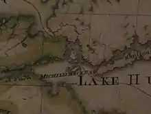 St. Joseph Island first appeared on European maps in the 1670s. A map by French explorer René de Bréhant de Galinée labels it "Anipich", after a Ojibwe word meaning "place of the hardwood trees".[8] The Ojibwe would call the island "Payentanassin" as well.[9] But by the 1740s the island came to be called "Saint Joseph" by Europeans, presumably so-named by Jesuit missionaries in honour of the church they were building on the island.[10] A 1735 French map is believed to be the first to use the name "Isle St. Joseph."[11] A detailed 1744 map by French geographer Jacques Nicolas Bellin depicts a route for batteau north east of the island and a canoe route on the south west, however it shows no mission or settlement real or abandoned anywhere on the island.[11] The name "Cariboux Island" was also given to the island briefly in the 1790s, though this only appears on a British map of the St. Marys River of the early 1790s[11] and is used incidentally within the St. Joseph Island Treaty in 1798.