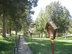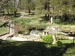 The Via Doloroso leads down a steep path to the bottom of the sinkhole containing the Schnurbusch Karst Window. The shrine features a statue of the Blessed Virgin Mary as Our Lady of Grace, a small altar for Masses, and amphitheater. A small waterfall flows out of the cave, and its water flows before the altar, under the stone bridge, and back into the cave.[3]