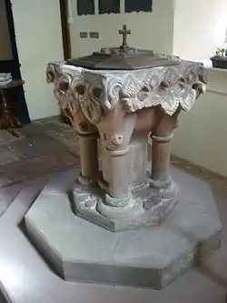 The date of the Font is unknown. However at the time of the Reformation it was grossly defaced and discarded, surplus to requirements. The wreckers had made large holes in each side and greatly defaced the ornamentation. When restored at a later date the craftsmen filled in the holes with plaster, reproduced the defaced ornamentation and added new pillars. They then applied a yellow pigment to hide the defects and covered the upper surface of the bowl with lead. The Font now stands on an octagonal base. In 1903, it was moved from a position under the west arch and now stands in the Baptistery. It is almost one metre in height and about sixty centimetres in diameter. On the west side are four double leafed ornaments; on the north and south sides there are three larger single leaf ornaments, and on the east is a winged demon with head bent down, closed wings and a curled and forked tail, each part of which ends in a serpent-like head, surrounded with fruit and leaves, and with a leaf in its mouth. The design is supposed to inculcate the idea that the evil spirit is expelled during the baptism of the child.[13]
