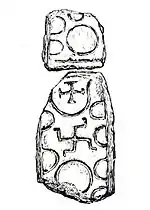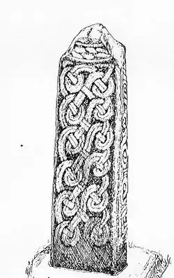 There are two shafts belonging to two spiral crosses, both are carved from white sandstone and each in two parts. One is 1.15 metres high and 40 centimetres wide. The top piece has plait-work in sham double strands; with bosses in every available place. The bottom piece holds a carved swastika. The two parts of the other slab are together 92 centimetres high and 38 centimetres wide and 15 centimetres thick. There is evidently a portion missing between the two. Two broad lateral bands passing round bosses, haze a central scroll at the top, whilst in the lower part are the body and legs of a man, with the swastika below. This has been taken as representing the crucifixion of Jesus. In all there are nine slabs in the vestry.[14]