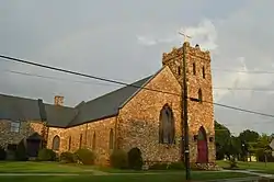 St. Luke's Episcopal Church, also known as The Rock Church, is a historic Episcopal church located at 604 Morgan Road in Eden, Rockingham County, North Carolina. It was built in 1926, and is a one-story Mission Gothic style solid masonry church. It has a gabled roof that is intersected by gabled transepts and a pointed arch tracery stained glass window. A stained-glass window at St. Luke's was given by Lily Morehead Mebane in memory of her mother, Mary Lily Connally Morehead.[2] It features a three-stage crenellated corner tower.[3]