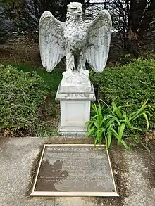 At the center of the walk is a white eagle statue and bronze plaque that reads: