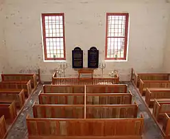 The interior of the church is laid out in two aisles running east and west, with a gallery extending across the west end, accessed by a staircase in the southwest corner of the building. Centered on the north wall of the church is the pulpit, which is crowned with a simple sounding board. The communion table, positioned on a raised platform, is centered on the east wall of the church. Original brick pavers still cover the aisles. The entire nave is covered by a barrel vaulted ceiling.
