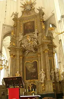 The gilded high altar depicts important biblical themes.