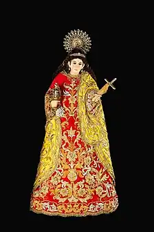The antique statue is a detailed wooden sculpture with carved hair, draped clothing and a pair of silver shoes, she holds a crucifix on her left hand and a jar of perfume on the right hand. Her detailed carved clothing is a mixture of pink, orange, gold and a hint of light green beneath the orange draping. This detailed wardrobe is not usually seen because, by tradition, the image is always clothed with a gown, usually red in color with gold embroideries and orange, yellow or golden cape. A long wig that reaches to the hem of the gown is also placed on top of her carved hair. Three yellow strips of ribbon (or sash) is pinned horizontally to her gown to secure the wig from being displaced, and at the bottom, a pocket catches the ends of her wig. Only the face and hands are repainted from time to time, and the rest of the image's original paint is untouched.
