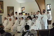 St. Michael's Abbey accepts members who are between the ages of 18 and 29. The initial four years are spent in the monastery, studying the required novitiate courses followed by a three-year cycle in Thomistic philosophy, after which the seminarians are sent to study at St Philip's Seminary[23] in Toronto, Canada, under the direction of the fathers of the Toronto Oratory. Upon completion of the three-year course in theology the students are granted the masters in theology degree. During this period or immediately after there is required a one-year apostolic experience. Following solemn profession all are required to have one year in Rome while living at the Norbertine Generalate and pursuing courses in pastoral theology at the Angelicum, the pontifical university under the direction of the Dominican Order. The association between the Abbey and the Angelicum dates back to 1973. At the conclusion of this formation the confreres may then be ordained as deacons and then priests before beginning to serve in the various ministries of the Order.[24]