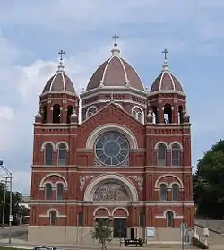 When Fr. A.L. Leininger became pastor of the parish in 1893, the church building was too small for the needs of the parish, despite being enlarged twice before. Rather than adding onto the existing structure, Leininger decided to build a new church in the Italian Renaissance style, similar to St. Peter's and St. Mark's.[3] Work began on the church on January 16, 1897, the cornerstone was laid by bishop John Watterson of Columbus on July 10, 1898, and dedicated by bishop Leo Haid , O.S.B., Vicar Apostolic of South Carolina, on August 27, 1899 as Watterson had died a year prior.[3][5] The distinctive dome of the church has dominated the Zanesville skyline ever since.[5]