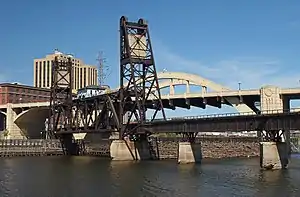 The St. Paul Union Pacific Vertical-lift Rail Bridge is a vertical-lift bridge that spans the Mississippi River in downtown St. Paul, Minnesota, United States. It is one of only three vertical-lift bridges along the Mississippi River, along with the Hastings Rail Bridge in Hastings, Minnesota, and the Wabash Bridge in Hannibal, Missouri. It was designed by Waddell & Harrington and built in 1913. In 1925, the north end of the bridge was raised about 16 feet (4.9 m) to tie in with tracks that served the St. Paul Union Depot yard. The vertical-lift span has 105-foot-high (32 m) towers, and the electrical lift system was built with a possible 45-foot (14 m) elevation. However, by 1973, the amount of lift was reduced to 37 feet (11 m) because of aging of the equipment.