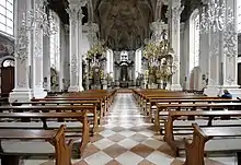 The construction of the new St. Peter's Church lasted from 1749 to 1756/57, and was carried out in the context of the valorisation of the bleaching district (Bleichenviertel). The church was consecrated 2 May 1756 by Archbishop Johann Friedrich Karl von Ostein.[2] With the beginning of secularization, the collegiate was repealed on 4 July 1802. Due to the fact that Mainz Cathedral lay partially in ruins St. Peter's was chosen for the inauguration of bishop Joseph Ludwig Colmar in 1803.[3]