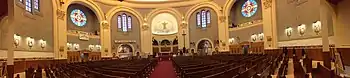 The interior decor has been enriched in phases by the parishioners, including stained glass windows from France on three sides, and a large mosaic of St. Teresa of Italian ceramic tiles with gold powder behind the main altar. Additional mosaics on side walls depict the baptism of Jesus and the Annunciation, as well as the Stations of the Cross. A Casavant organ was installed in 1953.[5]