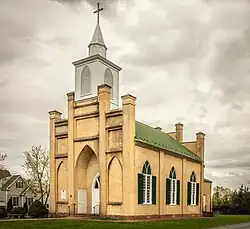 The building is a one-story, stepped gable-roofed, three bay by three bay church in the Gothic Revival style. It measures 30 feet (9.1 m) by 50 feet (15 m) and the recessed chancel measures 20 feet (6.1 m) by 10 feet (3.0 m).[4] The exterior is made of the original stucco, coursed ashlar, and brick, while the foundation is made of brick and stone.[3][4] The standing seam metal roof is flanked on either end by parapet walls. The cupola is made of wood and features Gothic style vents, an octagonal belfry with Gothic arches, pyramidal roof, and a wooden cross.[3]