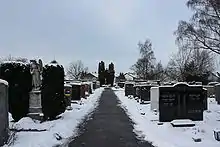 The still existing old mortuary was built in 1922. The first expansion of the new cemetery took place in 1954 and was completed on All Saints' Day 1955 with the consecration of the large cross in the center. Since the old mortuary had become too small for the rapidly growing town, plans for a new funeral home began in the early 1970s.[20] Due to the incorporation of Amendingen into Memmingen, the project was put on hold. It was not until 1977, after long negotiations with the city of Memmingen, that the new mortuary was built on the cemetery at a cost of 300,000 German marks and inaugurated on February 19, 1978.[21] The money was donated by the Amendingen land consolidation cooperative.