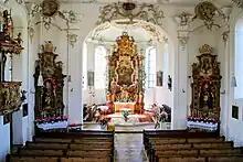 It is assumed that he based the interior design on the Buxheim parish church, which was decorated by the Zimmermann brothers. The three altars (high altar, Lady altar and Joseph altar) and the pulpit were created under the influence of Gabriel Weiß the Elder from Bad Wurzach and his son of the same name. The sculptors and carvers probably belonged to the circle of Anton Sturm from Füssen[11] and Dominikus Hermengild Herberger, a native of Upper Swabia.[12] The name of the fresco painter has not been handed down. The church was renovated for the first time in the 19th century. In 1922 the room shell and the frescoes were repaired. The large ceiling fresco, which was painted over during the first renovation, was renewed by Josef Albrecht. At about the same time, the door leading from the nave to the tower was bricked up and the entrance from the sacristy to the lower part of the tower was created. In 1949 the altars, the pulpit and the figures received new settings. The last comprehensive restoration took place from 1989 to 1997. During this time, the entire church was renovated and the choir was equipped with a new popular altar by Jörg Maxzin. In 2009, the retaining wall with the staircase, east of the church, had to be renovated at a cost of 135,000 euros, as its stability was no longer guaranteed.