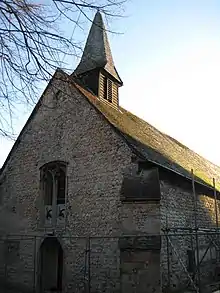 The church, a small building which "in scale [is] exactly like churches in nearby villages",[3] is built of stone and flint. The outside walls are rendered apart from at the east end, where the quoins are of stone dressed with ashlar, and the west end which is supported by substantial buttresses.[3] The stonework which has been obscured by render includes some reused fragments of herringbone pattern work of the Norman era and rubble taken from the demolished Roman walls around the city centre.[3] The windows, all lancets, vary in date from 13th- to 19th-century; the three-light east window dates from the latter. The doorway at the west end is 14th-century. On the roof is a weatherboarded bell-cot topped with a short broach spire.[3]