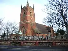 The churchyard is accessed by a rectangular Tudor-style lychgate, built of timber with a roof of red tile.[11] The churchyard is enclosed by a red brick wall. Together, the lychgate and boundary wall have been given a Grade II designation from English Heritage.[11]