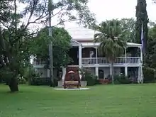 The site is heavily treed, except for a wide expanse of lawn to the west of the house. Two established Jacaranda trees sit between the north-west corners of the house and the allotment. A large native pine tree sits between the northern face of the house and the Kalare Street boundary. The second of the early photographs featured in the 1988 Morning Bulletin article suggests that part of the property was densely covered with trees as it is in 2003, but it is not possible to ascertain which remain from this earlier planting scheme, other than the date palms at the entry gate. The remains of a large clay pit are located on the two southerly adjacent allotments. These are not included in the heritage listing for St Aubins.[1]