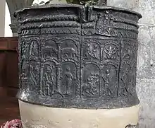 The font, made around 1200, is circular and made of lead. There are two courses of decoration: the upper course shows the signs of the zodiac, and on the lower course are depicted the agricultural labours appropriate to each month of the year. On an arch above each labour, the month, in early French, is shown.[1][4][5]