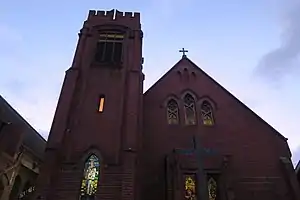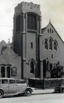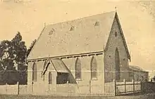 The first church building, a Gothic style wooden hall, was formally opened on 22 January 1885 at the south-eastern corner of Swan Street and Burnley Street, adjacent to the present Burnley railway station.[2] This building served both as a Sunday school hall and place of worship, and was served initially by clergy from neighbouring St Stephen's Church, Richmond.