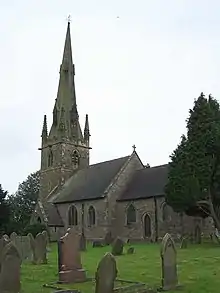 St Bartholomew's Church was redesigned by architect Ewan Christian and rebuilt in Butterton in 1871.[3] It has a tower with two bells.[4] The church is on the site of an earlier place of worship.[3] The church's spire, which was added in 1879, dominates the local landscape and is one of the newest spires in the Peak District.[4] Within the church there is a memorial plaque to Joseph Wood, Rowland Cantrill and William Hambleton, who all died trying to rescue Joseph Shenton from a disused mineshaft in 1842.[5]