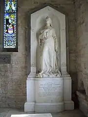 Most of the memorials in the church are to the Scudamore family. Between the chancel and the south chapel is a chest tomb dating from around 1550 bearing the alabaster effigies of John Scudamore and his wife Sibell. John Scudamore is dressed in armour, and his feet rest on a lion; she is dressed in a long gown. Along the sides of the tomb are shields containing coats of arms. On the north wall of the chancel is the white marble monument in Baroque style to James Scudamore who died in 1668. It contains a sculpture representing James Scudamore in a sitting position, wearing Roman dress. Above his head are two cherubs, and the whole is framed between two pilasters. To the left of this monument is one to his widow, Jane, also in Baroque style. In the south aisle is a wall monument to James Scudamore, 3rd Viscount Scudamore who died in 1716. This consists of a sarcophagus on which is an urn and two seated putti. Lower down, on each side of the sarcophagus, are two wreathed skulls. The whole is surrounded by Ionic columns and a broken segmental pediment. On the east wall of the south chapel is a monument to Mary Scudamore Stanhope, wife of Sir Edwyn Francis Scudamore Stanhope of Holme Lacy, who died in 1859. This was sculpted by Matthew Noble in white marble, and depicts a female figure standing in a niche. In the north chapel is another marble wall monument by Noble. This was to Chandos Scudamore Stanhope, a captain in the Royal Navy who died in 1871 and consists of an angel above an anchor.[1]
