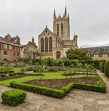 This church was largely rebuilt, starting in 1503, in the Perpendicular style by John Wastell, a master mason who also worked on King's College, Cambridge.[4] Further alterations to the building were undertaken in the 18th and 19th centuries, notably a new chancel and a hammerbeam roof by George Gilbert Scott.[5] When the Diocese of St Edmundsbury and Ipswich was created in 1914, St James's Church was made the cathedral. In 1959 Benjamin Britten wrote the Fanfare for St Edmundsbury for a "Pageant of Magna Carta" held in the cathedral grounds.[6]