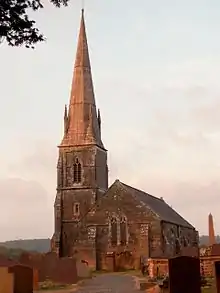 St Edwen's is built from local red gritstone, formed into square blocks and dressed with sandstone. The roof is made from slate with stone edging. The church, which is in the Late Decorated style, has a tower topped with a broach spire at the north-west corner of the nave, supported by buttresses. The church is entered through a porch with an arched doorway in the lowest of the three stages of the tower.[2] Inside, the woodwork of the roof is exposed; some of the nave timbers might be medieval beams reused in the 1856 rebuilding.[2][9] The nave and chancel are divided by an arch and by three steps leading up from the nave. The chancel and sanctuary are separated by an altar rail set on top of some wooden panels.[2]
