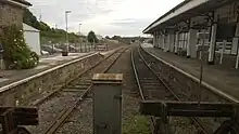 Because the main line is on a falling gradient towards Hayle, at the buffer stop end of platform 3 a few steps are needed to connect platforms 2 and 3 but at the east end they are nearly level. Standing at this end of the station the line to St Ives curves away to the left over Western Growers Crossing towards the covered way beneath the A30 road. The Cornish Main Line towards Hayle drops gently to the right with the signal box situated between the two.[18] The Down Sidings on the right of the main line are level and so are higher than the main line at the far end. In 2022, platform 3 was extended by 6 metres (20 feet) to allow it to accommodate a train with five carriages.[21]