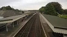 The station buildings are constructed of granite in an 'L' shape west and north of the St Ives bay platform. The booking office is staffed for part of the day and is located in the west-facing section which faces the station car park. The northern range incorporates staff accommodation as well as refreshment facilities which appeared in a list of the ten best station cafes published in The Guardian in 2009.[17] Platforms 2 and 3 have a long canopy above them to protect passengers waiting for their train. At the west end of this is a covered footbridge which links with the main westbound platform for trains to Penzance, and a large wooden shelter is provided here. A small granite building further up the platform is for staff use. As with several other stations in Cornwall, small palm trees grow on the main platforms, both of which can accommodate seven-coach trains.[18]
