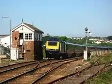 On 1 June 1877 a branch line was opened from here to St Ives, which was when the station was renamed 'St Erth'.[7] The station building was reconstructed in granite[8] and a second track was laid on the north side of the platform for branch line trains, but the main line still had only the one track. This was partly rectified in about 1894 when a loop line with its own platform was opened, but the line was only doubled eastwards to Hayle on 10 September 1899, and westwards to Marazion on 16 June 1929.[6] Beyond the St Ives branch platform was the station goods yard and sidings which served a china clay dry for a few years. It then served milk trains from the Primrose Dairy creamery, later operated by United Dairies,[9] although these were taken out of use in 1982.[10] A camping coach was positioned here by the Western Region from 1953 to 1964, there were two coaches here for the last three years.[11]