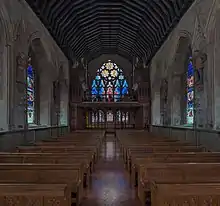 In 1952, new stained glass by Joseph Nuttgens was installed in the east window. It features the Trinity, the evangelists Matthew, Mark, Luke, and John, as well as the Virgin Mary and Saints Joseph, Bridget of Kildare and Etheldreda. The stained glass windows in the south wall depict scenes from the Old Testament, and the ones in the north wall show scenes from the New Testament.
