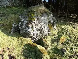 Also known as St Fillan's Chair or Pulpit (NS 38396892), this whinstone block is located against the drystone dyke on the western side of the lane. It is a natural boulder that faces south and overlooks the kirk and a field, in the corner of which stands St Fillan's Well. A circular hollow forms a south facing seat and to the right hand side is a smaller oval hollow. Local tradition records that St Fillan sat in this chair, preached and baptised converts and babies with holy water from the cup that had been collected from the nearby well.[11] It is also said to cure rheumatism with the afflicted person first sitting on the seat and then being hauled down the hill by their feet to conclude the cure, although this may be a confusion with another Scottish St Fillan's Seat.[12] Old engravings show that the soil level at the area of the seat has been significantly eroded through rainfall and the actions of cattle and horses.[13][14]