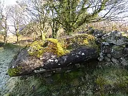 St Fillan's holy well has probably been venerated since pre-Christian times and the spring water used by the saint himself. The water flows from beneath a large isolated rock that may have fallen from above and flows into a now ruinous round-shaped brick and stone basin. The holy water was thought to miraculously cure ailing children or those with rickets; pieces of cloth and rags being tied to overhanging branches at the well as votive offerings. The radical Calvinist minister, James Hutcheson, had the well filled with stones in around 1690, however this was later cleared out as the water continued to flow and it was even piped to the old farm for domestic use that may explain the current presence of brickwork at the site.[15]