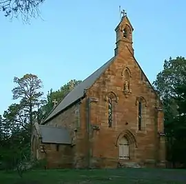 Designed in 1842 in an Early English Gothic idiom of around the mid-thirteenth century, the church consists of: a four-bay nave, buttressed at the corners, with north porch and a single bellcote astride the west gable; a two-bay chancel with diagonal buttressing to its east wall; and a sacristy abutting the chancel south wall. It is constructed of ashlar sandstone and has corrugated iron roofs. The nave and porch interiors are of ashlar sandstone, the chancel and sacristy being plastered. The nave has an open timber roof with arch-braced collar tie trusses having arch-braced king posts. The chancel has a plaster ceiling dating from the last quarter of the twentieth century. The floors are wooden. The chancel is equipped with stone sedilia and piscina as well as an Easter sepulchre recess. Rougher finish to the stonework of the nave east wall interior above the level of the north and south walls indicates that the surface was designed to receive a Doom painting. With the exception of the chancel, porch and sacristy ceilings and the corrugated iron roofs, the entire structure is original and intact and unaltered.[1]