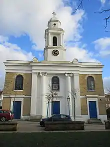 Busby designed St George's Church in a Neoclassical style, with simple clean lines and strong symmetry.[4] The exterior consists of yellow brick with some stucco work, regularly spaced tiered pairs of round-headed windows, and a deep cornice with no ornamentation. The western face, where the entrance is situated, has Ionic columns and pilasters on each side of the door, and a central tower topped by a cupola with a small cross.[4] Clock faces were added on each side soon in 1840.[4][5] Inside, there are galleries at the northern, southern and western sides, reached by curved staircases. There was a three-tier pulpit in front of the reredos at the eastern end, and the organ, by the J.C. Bishop & Son organ builder firm, was initially inside the western gallery.[4][10]