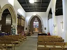 The entrance from the west tower has a round-arched doorway leading into a vestibule with two flights of stairs. A pointed-arched doorway separated the vestibule from the nave and lesser doors lead to the north and south aisles. The nave has a six-bayed south arcade with Doric columns decorated with lion masks. There is a pointed arch in front of the sanctuary with a stone rederos and the east window designed by C.E. Kempe installed in 1879. It depicts the Crucifixion, the Resurrection and the Assention. The west wall is decorated with the coat of arms of George I of Great Britain.