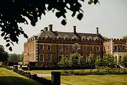 Built in 1651, the Grade I listed house stands in a vast park through which the River Allen flows, feeding a seven-acre lake as it winds its way towards the small parish village of Wimborne St Giles.[2] The 17th-century house is a low, quadrangular building. Although the name of the architect is not known, the influence of Inigo Jones is obvious in the Renaissance north and east fronts with their Classical façades. The original plan of the house called for a square courtyard, to which was added two large ground floor rooms, with additional rooms on the second and third floors. The house was once completely crenellated along the edge of the parapet (or shorter walls), however most of these fortifications were removed in the 19th century. The east front, with its seven bays, remains much the same today.[3]