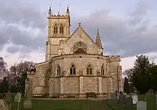 The second church was built on a new site, by the York to Selby road. It was a brick structure, in the classical style, and was consecrated in 1783. However, in 1857, it was replaced by the current church, a stone structure in the Perpendicular style, designed by Francis Penrose.[1] The new structure cost £26,000 to build. The church survives today, with a vestry added in 1896. A fire in 1923 destroyed the furnishings, but the church was quickly restored by John Bilson, and reopened to worship in 1925. In 1966, the church was Grade II* listed.[2][3]