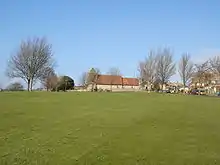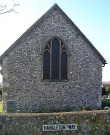 Hangleton existed at the time of the Domesday Book of 1086, although the church was not mentioned; its first known reference is in 1093 when William de Warenne, 2nd Earl of Surrey put it under the control of Lewes Priory.[2] The church stood between the manor house and the cottages and houses of the village to the northeast, and was a rectangular building 62 feet (19 m) long and 17.5 feet (5 m), with flint walls 3.5 feet (1 m) thick.[3] Rebuilding began in the 12th century. The nave dates from that century, while the square tower was added in the 13th century[4][5] and the church was re-roofed at that time (having originally been thatched).[3] The 12th-century chancel was rebuilt in around 1300.[4]