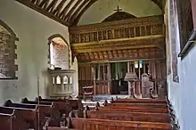 The church contains a remarkable medieval rood screen and rood loft, c. 1500, restored during Seddon's 19th-century reconstruction.[3] This has been described as "a breathtaking sight, rising almost to the roof"[6] and "one of the most spectacular rood screens" in the area.[7] It has been suggested that the village's remoteness saved the screen from destruction by the Puritans.[8] Newman writes that "the glory of the interior is the rood screen and loft",[2] which Cadw describes as "one of the finest in Britain" and of "exceptional richness and complexity".[1] It was heavily, but sympathetically, restored by Seddon. Of the same, latter, date, are the lectern, the font, the choir stalls, the pews and the tiling throughout the church, the whole representative of Seddon "at his most imaginative."[2]