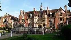 St John's Beaumont School is a private day and boarding Jesuit preparatory school, and is for boys and girls (from September 2023) aged 3 to 13 years old.[1] It is situated between Englefield Green and Old Windsor on Priest's Hill, with the school building in Surrey and the sports fields in Berkshire. It was opened in 1888, and it is the oldest purpose-built preparatory school in the UK.[2] The building is Grade II listed and was designed by John Francis Bentley in Tudor style with a Perpendicular chapel,[3] and it was named St John's, in honour of St John Berchmans, who was canonised that year.[4]