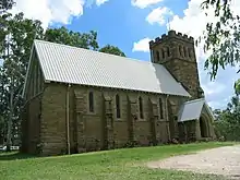 St. John's Church at Mundoolun is a private family chapel built in 1901 on a property settled by the Collins family in the 1840s. The property is located between Canungra and Beaudesert in the Albert River Valley, South East Queensland. The church is constructed of local sandstone to the design of the Brisbane Diocesan Architect John Buckeridge who was commissioned by the Collins family in 1899.[1]