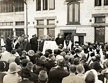 The college building was designed by the Australian ecclesiastical architect John Horbury Hunt.[7] (Hunt had designed the cathedrals in Grafton, Newcastle and Armidale.) The bishop was the first warden and did all the lecturing; there were just five students.[8] [9] The college was dedicated in 1899 by Saumarez Smith, Archbishop of Sydney.[10] Three further wardens followed in short succession, adding new buildings.[11] The visionary churchman[12] Ernest Burgmann was appointed Warden in 1918, which was to be transformative for the college.[13] On the invitation of Reginald Stephen, Bishop of Newcastle, in 1925 Burgmann moved the college to Morpeth.[14] The Armidale college buildings now form part of the New England Girls' School.[15] A stained glass window that had gone with the college to Morpeth was returned to NEGS in 2012.[16]